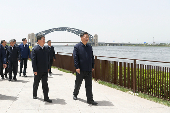 2020年5月12日,习近平总书记在汾河太原城区晋阳桥段考察汾河水治理及沿岸生态保护、城市环境建设等情况。新华社记者 李学仁摄