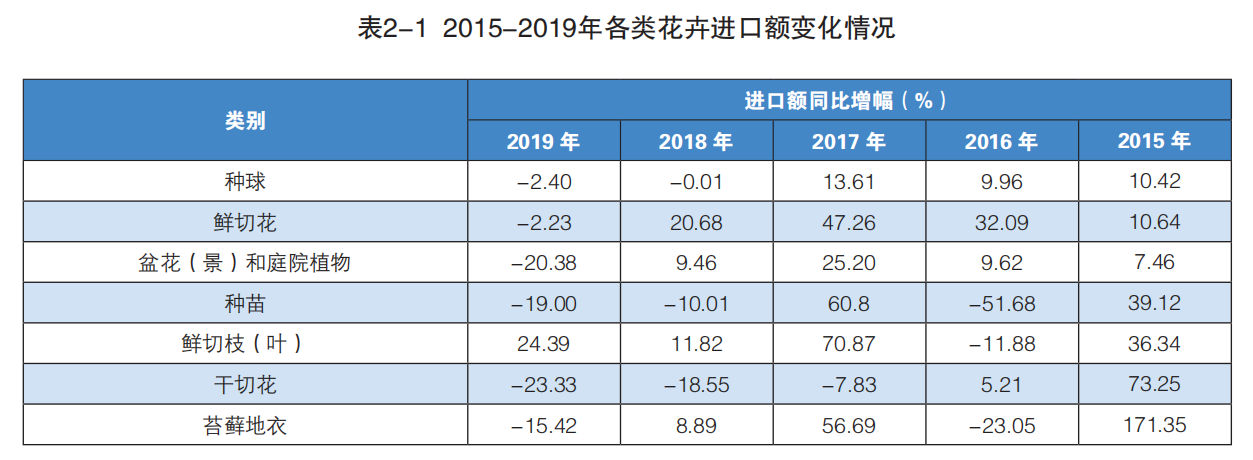 从2018年开始到2019年,在花卉进口7个类别中,除鲜切枝(叶)外,种球、盆花(景)和庭院植物、鲜切花、种苗、干切花、苔藓地衣类别的进口增幅势头开始出现明显下滑(见表2),一方面意味着我国花卉生产的进口替代率在增强,另一方面也可以反映我国花卉消费市场出现了较大的变化。
