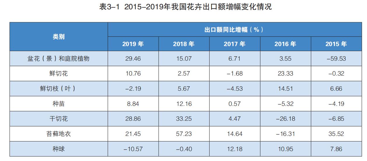 从2015-2019年这5年的花卉出口额变化幅度看,我国盆花(景)和庭院植物、鲜切花、种苗出口稳步增长,特别是盆花(景)和庭院植物增长势头强劲(见表3)。
