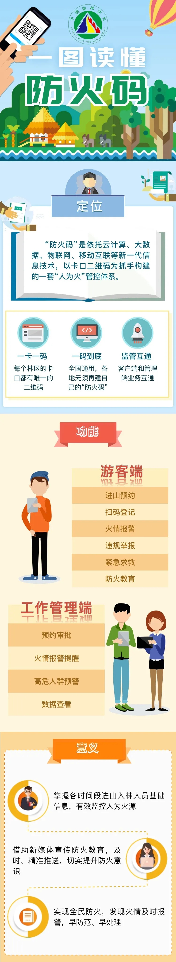 “防火码”具备数据采集、宣传教育、火情报警、违规举报、紧急求救等功能,主要提供使用对象为因各种活动进出入森林草原防火检查站、临时卡口、国有林场、各类自然保护地的人员及车辆。