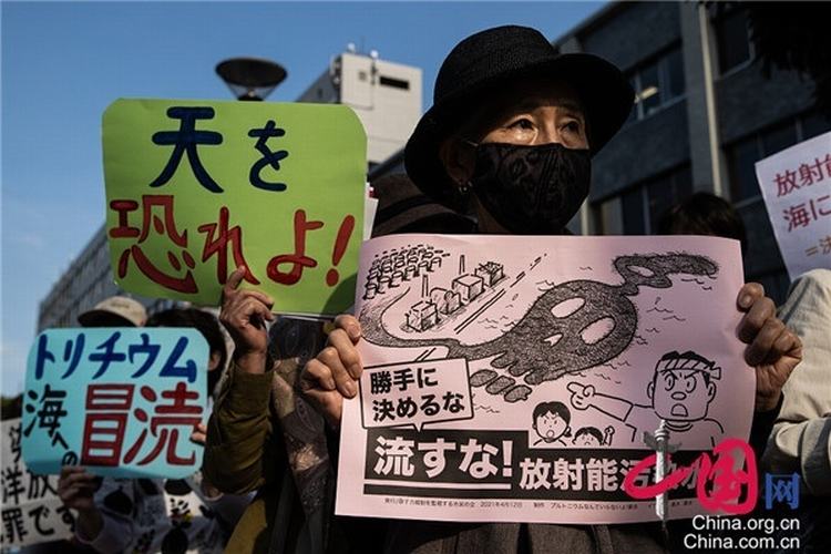 当地时间2021年4月12日,日本东京,活动人士在首相官邸外参加抗议活动,反对日本政府计划将福岛第一核电站的核污水排入大海。图片来源:视觉中国 日本如果一意孤行,国际社会该如何应对?